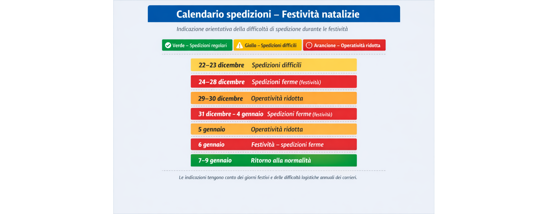 Durante le festività natalizie molti magazzini, centri di smistamento e filiali operative lavorano a ranghi ridotti o restano completamente chiusi. In alcune giornate, la spedizione è di fatto impossibile, anche se l’ordine è già pronto.