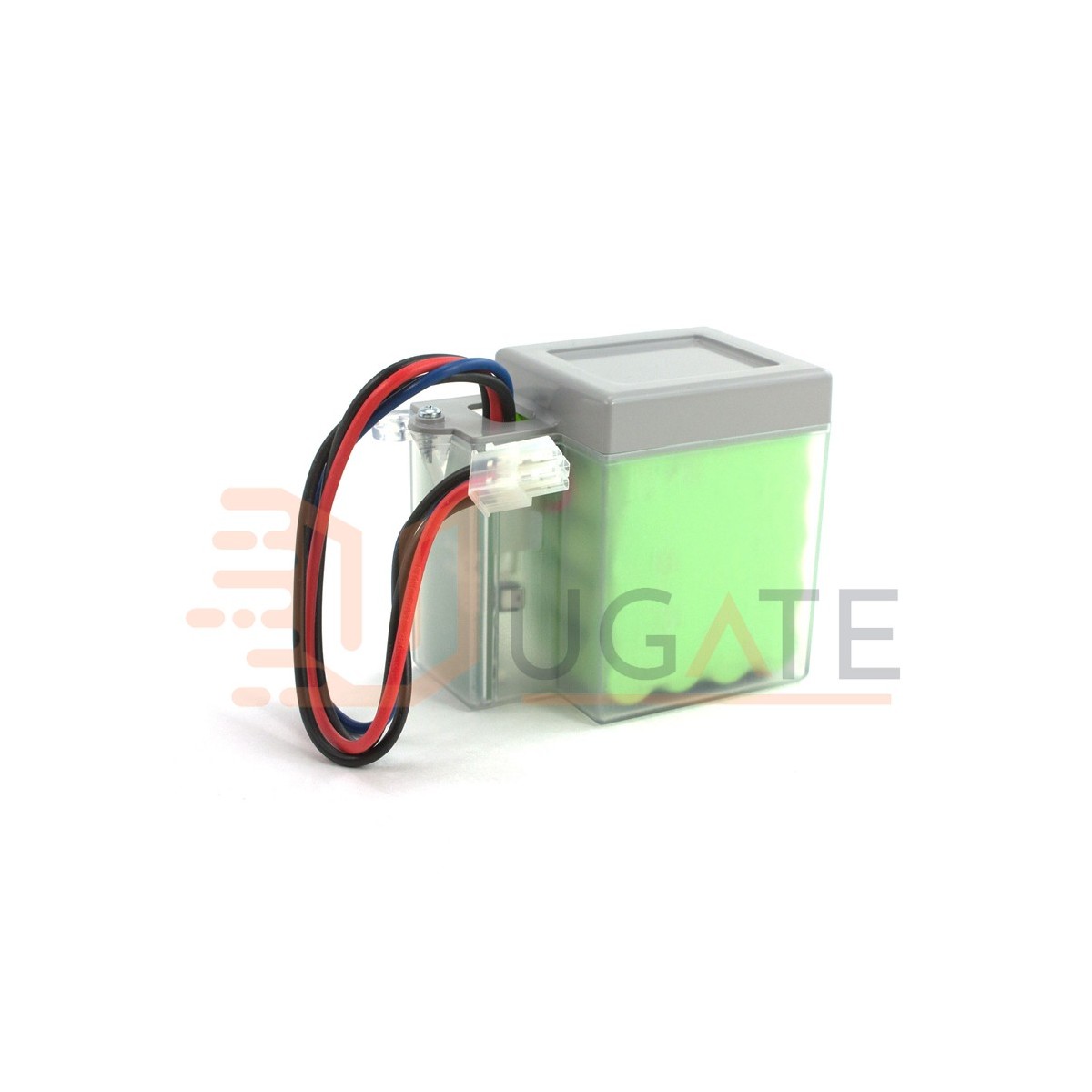 A bateria tem uma placa de carregamento no interior e gestão automática em caso de falha de energia e alojada numa caixa de plástico